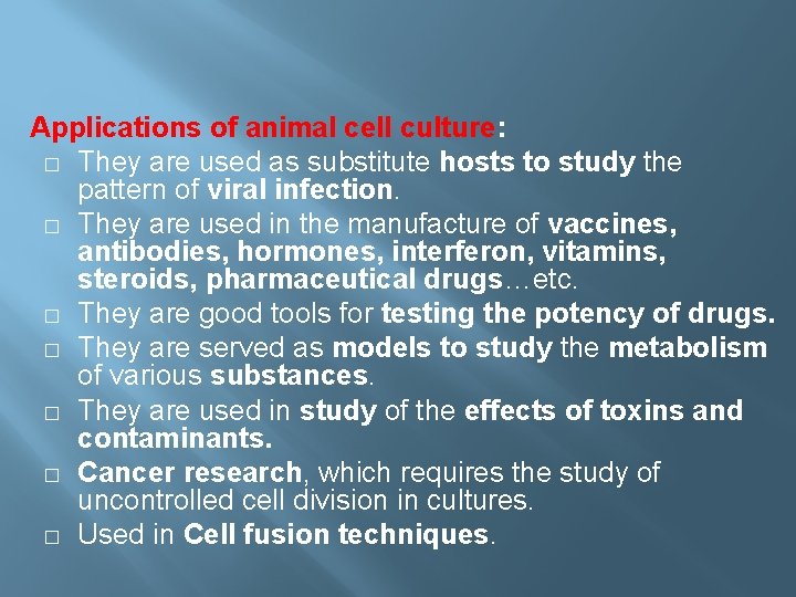 After the cells of interest have been isolated from living tissue, they can subsequently be maintained under carefully controlled conditions. We did not find results for: Maybe you would like to learn more about one of these? Application of animal cell culture. Check spelling or type a new query.